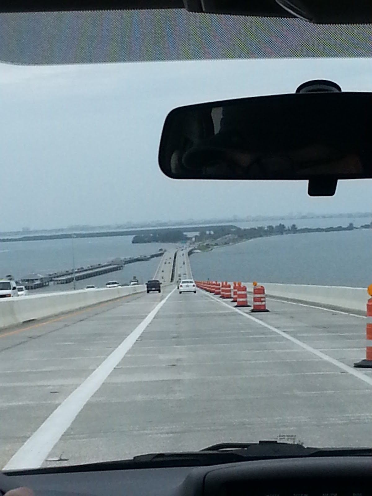 We moesten een eind rijden naar Crystal River, zo'n 340 km en namen bij St. Petersburg nog een kleine omweg zodat we over de Sunshine skybridge konden rijden, een soort achtbaan op de Highway. En high was hij! Voor we de brug opreden, maakten we nog een korte stop bij een picknickplek met mooi uitzicht op de brug.